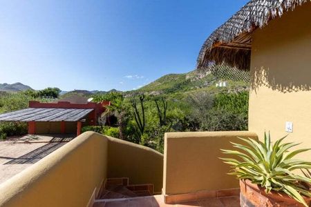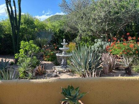 En la planta baja, un hermoso pasillo conecta todas las habitaciones con el patio central y la parte frontal de la casa. La recámara principal incluye baño privado, mientras que las otras dos habitaciones cuentan con baños medios, todas con acceso al área del patio central. Además, en la planta baja hay una tina para refrescarse, una regadera exterior, y un medio baño, junto con el cuarto de lavandería y un armario para almacenamiento. Alrededor de esta encantadora propiedad, hay una hermosa fuente de agua que adorna el jardín exótico.
