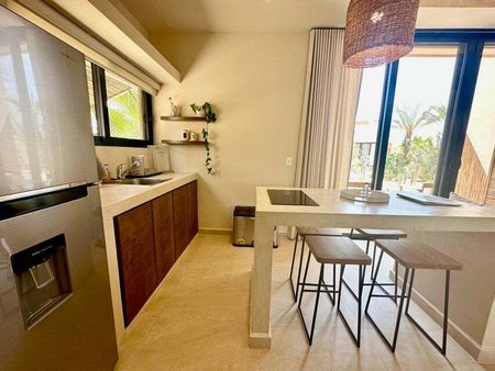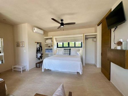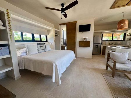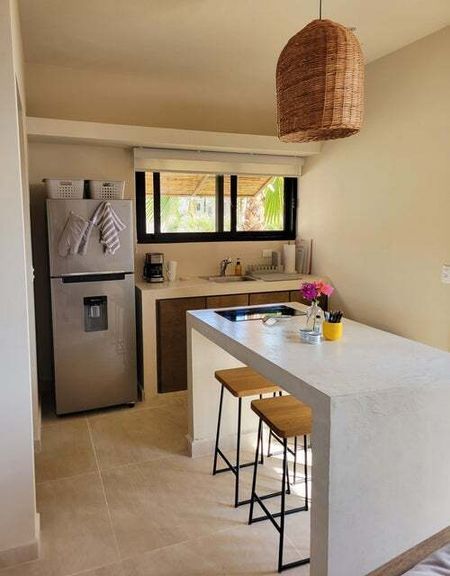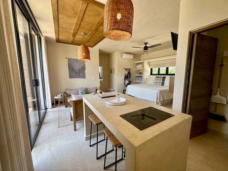 El diseño cuidadoso incluye muebles personalizados locales, un ambiente luminoso y abierto, A/C, baño completo, despensa/lavandería y cocina.