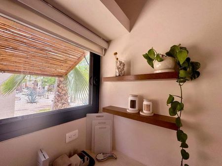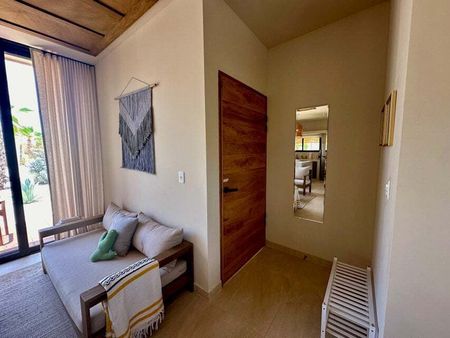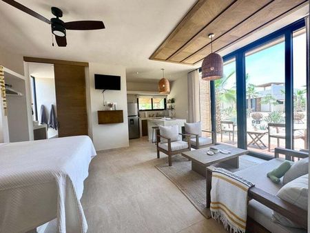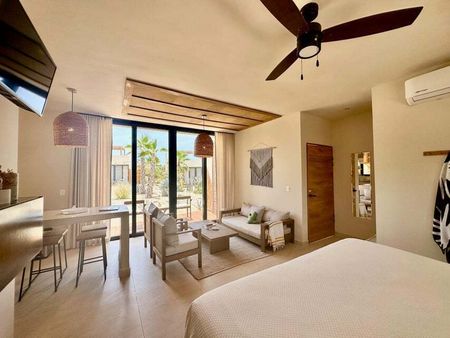 Bungalow 2 en Casa Hygge se presenta con la marca “Rayo de Sol”, un elegante estudio dentro de una comunidad sustentable en El Pescadero, a pocos minutos en auto de la playa San Pedrito.