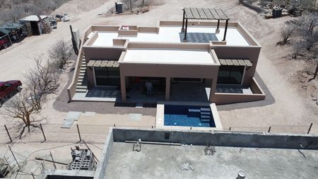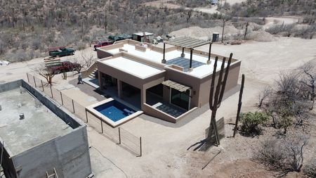 2BR house with pool and ocean view for $349,900 USD! Casa Pitahaya is a new 2BR/2BA home with pool, rooftop terrace and covered parking pergola on a 900 m2 lot that offers great views of the Bay of La Paz, city lights and mountains. The house features 1,241 ft2 of interior living space and 1,781 ft2 of total construction. The main living area has an open kitchen with large island, living room and dining room spaces with a wall of sliding glass doors to the covered patio and sparkling pool of 3m x 4m. Stairs to the rooftop terrace with shade pergola offer amazing sunset and ocean views. The house includes custom carpentry, granite and marble counters, stainless appliances, and A/C units in each room. The lot has power, water and fiber optic internet available.