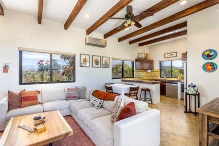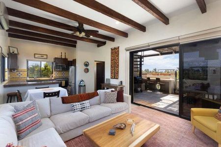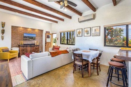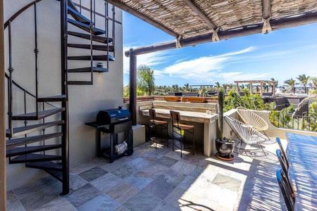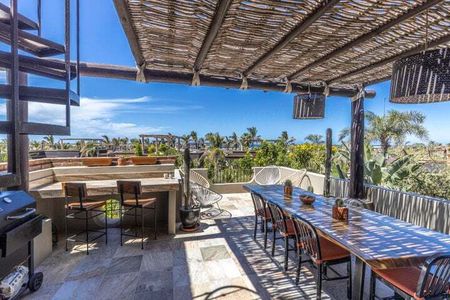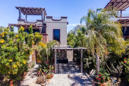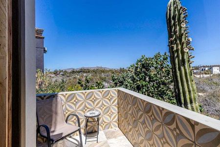 Diseñada por el arquitecto Hiram Arce, esta casa combina acentos tradicionales mexicanos con un diseño moderno de espacios abiertos que aprovechan la luz natural. Todas las habitaciones están en la planta baja, mientras que el segundo nivel ofrece un diseño de planta abierta con dos terrazas que amplían las áreas de vida al aire libre y ofrecen vistas panorámicas. La terraza más grande ofrece una vista espectacular al océano, mientras que la más íntima tiene vistas al hábitat natural del desierto y a las montañas Sierra de la Laguna, el lugar perfecto para disfrutar de tu café matutino o un cóctel al atardecer.