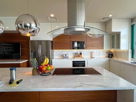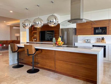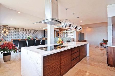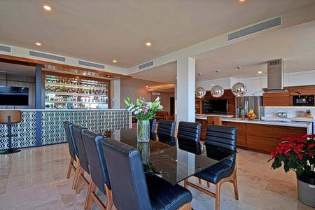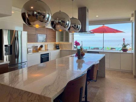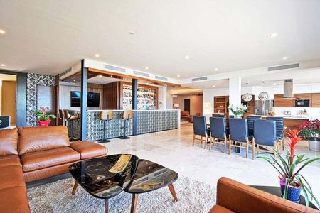Elegantly designed with marble counters and floors, professionally equipped bar and chef's kitchen with island and seating for 6, this open-concept home features sliding glass walls that seamlessly merge indoor and outdoor living. The sleek bar includes 2 wine coolers, and the kitchen features an extra beverage coolerjust walk in and make your martini. With five bedrooms and four bathrooms, including accommodation for your cook/housekeeper, this penthouse redefines exclusivity and sophistication. The features of this extraordinary home include hurricane blinds to provide security for the great room and kitchen windows, 4 central A/C units, 5 mini-splits, recently resealed roof, water softener, Starlink internet throughout...the list goes on and on. Though the building is 10 years old, this unit was newly constructed just a year ago, making it a fresh and rare find in the market.