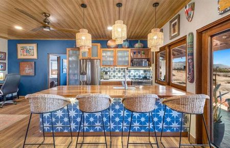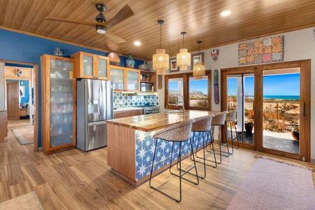 La cocina cuenta con barra/isla con asientos para 3 personas, electrodomésticos modernos, gabinetes de madera hechos a medida, lámparas de diseño y acentos de cerámica.