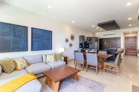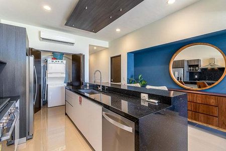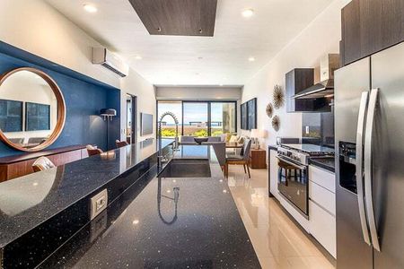 La cocina está equipada con cubiertas de granito y electrodomésticos de acero inoxidable. La recámara principal se abre directamente a la terraza, y ambas recámaras cuentan con baño completo. También hay un baño de visitas para mayor comodidad.